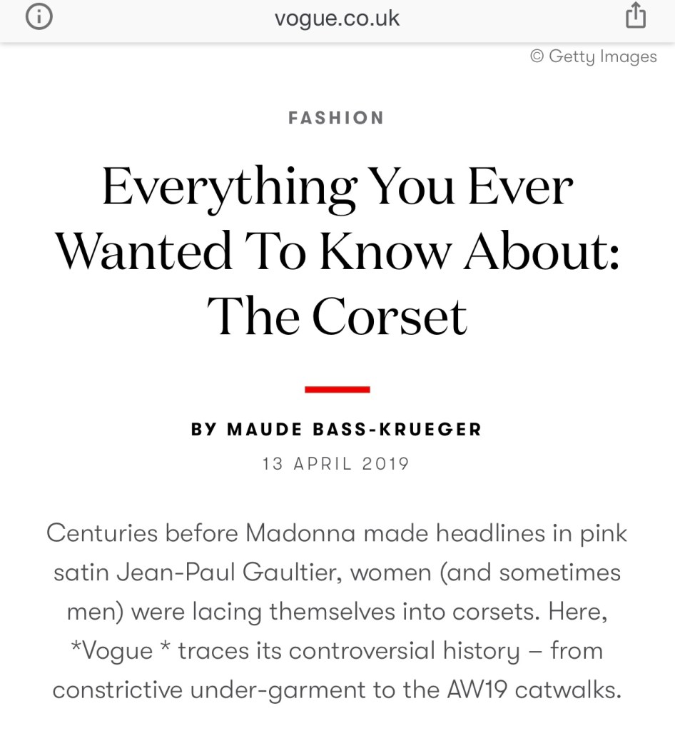 With the history of corsets leading back to the 16th century, they have a controversial background that is said to have deformed the female body although not all women agree and there is no write answer to each experience some woman have even found them as a positive. Corsets have never been out of style and some men and woman use them to this day. ’In the ’70s, Vivienne Westwood began using corsets as part of her historicist punk aesthetic; Westwood imagined her corsets as empowering women rather than binding them’ -Maude Bass-Krueger Vogue 2019